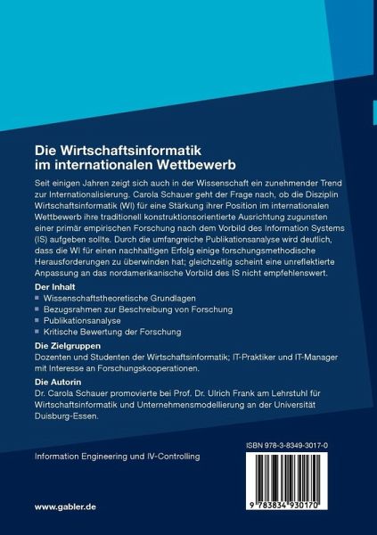 Seit einigen Jahren zeigt sich auch in der Wissenschaft ein zunehmender Trend zur Internationalisierung. Carola Schauer geht der Frage nach, ob die Disziplin Wirtschaftsinformatik (WI) für eine Stärkung ihrer Position im internationalen Wettbewerb ihre traditionell konstruktionsorientierte Ausrichtung zugunsten einer primär empirischen Forschung nach dem Vorbild des Information Systems (IS) aufgeben sollte. Durch die umfangreiche Publikationsanalyse wird deutlich, dass die WI für einen nachhaltigen Erfolg einige forschungsmethodische Herausforderungen zu überwinden hat; gleichzeitig scheint eine unreflektierte Anpassung an das nordamerikanische Vorbild des IS nicht empfehlenswert.