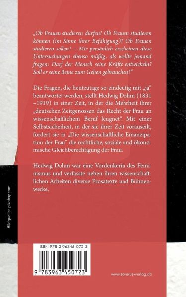 "Ob Frauen studieren dürfen? Ob Frauen studieren können (im Sinne ihrer Befähigung)? Ob Frauen studieren sollen? - Mir persönlich erscheinen diese Untersuchungen ebenso müßig, als wollte jemand fragen: Darf der Mensch seine Kräfte entwickeln? Soll er seine Beine zum Gehen gebrauchen?"Die Fragen, die heutzutage so eindeutig mit "ja" beantwortet werden, stellt Hedwig Dohm (1831 -1919) in einer Zeit, in der die Mehrheit ihrer "deutschen Zeitgenossen das Recht der Frau an wissenschaftlichem Beruf leugnet". Mit einer Selbstsicherheit, in der sie ihrer Zeit vorauseilt, fordert sie in "Die wissenschaftliche Emanzipation der Frau" die rechtliche, soziale und ökonomische Gleichberechtigung der Frau. Hedwig Dohm war eine Vordenkerin des Feminismus und verfasste neben ihren wissenschaftlichen Arbeiten diverse Prosatexte und Bühnenwerke.
