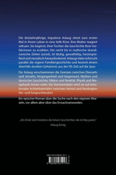 Die dreizehnjährige, impulsive Aslaug stürzt zum ersten Mal in ihrem Leben in eine tiefe Krise. Ihre Mutter reagiert seltsam: Sie beginnt, ihrer Tochter die Geschichte ihrer Vorfahrinnen zu erzählen. Die reicht bis in mythische skandinavische Zeiten zurück, ist blutig, gewalttätig, herzergreifend und moralisch herausfordernd. Aslaugs Vater erforscht parallel die eigene Familiengeschichte und kommt einem ebenfalls dunklen Geheimnis aus der NS-Zeit auf die Spur. Für Aslaug verschwimmen die Grenzen zwischen Diesseits und Jenseits, Vergangenheit und Gegenwart, Mythen und deutscher Geschichte, Fiktion und Realität, Physik und Metaphysik immer mehr. Ein Dreivierteljahr wird sie auf emotionaler Achterbahnfahrt zwischen Verlust und Neubeginn hin- und hergeschleudert.Ein epischer Roman über die Suche nach den eigenen Wurzeln, vor allem aber über das Erwachsenwerden. Für Leserinnen und Leser ab 12 Jahren.