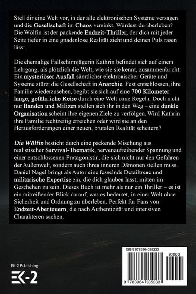 Stell dir eine Welt vor, in der alle elektronischen Systeme versagen und die Gesellschaft im Chaos versinkt. Würdest du überleben? Die Wölfin ist der packende Endzeit-Thriller, der dich mit jeder Seite tiefer in eine gnadenlose Realität zieht und deinen Puls rasen lässt. Die ehemalige Fallschirmjägerin Kathrin befindet sich auf einem Lehrgang, als plötzlich die Welt, wie sie sie kennt, zusammenbricht: Ein mysteriöser Ausfall sämtlicher elektronischer Geräte und Systeme stürzt die Gesellschaft in Anarchie. Fest entschlossen, ihre Familie wiederzusehen, begibt sie sich auf eine 700 Kilometer lange, gefährliche Reise durch eine Welt ohne Regeln. Doch nicht nur Banden und Milizen stellen sich ihr in den Weg - eine dunkle Organisation scheint ihre eigenen Ziele zu verfolgen. Wird Kathrin ihre Familie rechtzeitig erreichen oder wird sie an den Herausforderungen einer neuen, brutalen Realität scheitern? Die Wölfin besticht durch eine packende Mischung aus realistischer Survival-Thematik, nervenaufreibender Spannung und einer entschlossenen Protagonistin, die sich nicht nur den Gefahren der Außenwelt, sondern auch ihren inneren Dämonen stellen muss. Daniel Nagel bringt als Autor eine fesselnde Detailtreue und militärische Expertise ein, die dich glauben lässt, mitten im Geschehen zu sein. Dieses Buch ist mehr als nur ein Thriller - es ist ein mitreißender Blick darauf, was es bedeutet, in einer Welt ohne Sicherheit und Ordnung zu überleben. Perfekt für Fans von Endzeit-Abenteuern, die nach Authentizität und intensiven Charakteren suchen. Worauf wartest du? Tauche ein in die düstere Welt von Die Wölfin und erlebe ein Abenteuer, das dich nicht mehr loslässt. Sichere dir jetzt dein Exemplar und mach dich bereit für einen Thriller, der dich elektrisieren wird!