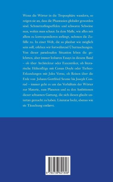 Wenn die Wörter in die Troposphäre wandern, so zeigen sie an, dass die Phantasien globaler geworden sind. Schmetterlingseffekte und schwarze Schwäne nun, wohin man schaut: In dem Maße, wie alles mit allem zu korrespondieren anfängt, nehmen die Zufälle zu. In einer Welt, die so planbar wie möglich sein soll, erleben wir fortwährend Überraschungen. Von dieser paradoxalen Situation leben die gelehrten, aber immer lesbaren Essays in diesem Band - ob über Architektur oder Exzentriker, ob literarische Höhenflüge mit Conan Doyle oder Tiefsee-Erkundungen mit Jules Verne, ob Reisen über die Erde von Johann Gottfried Seume bis Joseph Conrad - immer geht es um das Verhältnis der Wörter zur Materie, zum Planeten und zu den Ambitionen dieser seltsamen Gattung, die sich diesen glaubt untertan gemacht zu haben. Literatur lockt, ebenso wie sie Täuschung entlarvt.