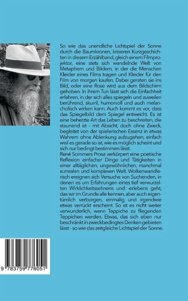 So wie das unendliche Lichtspiel der Sonne durch die Baumkronen, kreieren Kurzgeschichten in diesem Erzählband, gleich einem Filmprojektor, eine stets sich wandelnde Welt von Metaphern und Bildern, in der die Menschen Kleider eines Films tragen und Kleider für den Film von morgen kaufen. Dabei geraten sie ins Bild, oder eine Rose wird aus dem Bildschirm gehoben. In ihrem Tun lässt sich die Einfachheit erfahren, in der sich alles spiegeln und zuweilen berührend, skurril, humorvoll und auch melancholisch wirken kann. Auch kommt es vor, dass das Spiegelbild dem Spiegel entweicht. Es ist eine beherzte Art das Leben zu beschreiten, die staunend ist - mit Absicht, doch ohne Zweck, begleitet von der spielerischen Essenz in etwas Wahrem ohne Ablenkung aufzugehen, einfach weil es gerade so ist, wie es möglich scheint und sich nur bedingt bestimmen lässt. René Sommers Prosa verkörpert eine poetische Reflexion einfacher Dinge und Tätigkeiten in einer alltäglichen, ungewöhnlichen, manchmal surrealen und komplexen Welt. Wolkenwandlerisch ereignen sich Versuche von Suchenden, in denen es um Erfahrungen eines tief verwurzelten Wirklichkeitssehnens und -erlebens geht, das wir im Grunde alle kennen, aber auch eigentümlich verborgen, einmalig und irgendwie etwas verrückt erscheint. So ist es nicht weiter verwunderlich, wenn Teppiche zu fliegenden Teppichen werden. Etwas, das sich eben nur beschränkt in zweckbedingtes Denken gebieten lässt - so wie das zeitgleiche Lichtspiel der Sonne.