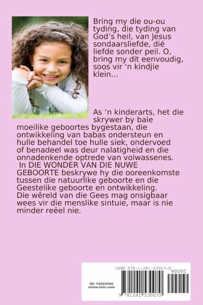 As 'n kinderarts, het die skrywer by baie moeilike geboortes bygestaan, die ontwikkeling van babas ondersteun en hulle behandel toe hulle siek, ondervoed of benadeel was deur die nalatigheid en die onnadenkende optrede van volwassenes. In DIE WONDER VAN DIE NUWE GEBOORTE beskrywe hy die ooreenkomste tussen die natuurlike geboorte en die Geestelike geboorte en ontwikkeling. Net soos 'n kind nie normaal kan ontwikkel as hy/sy nie behoorlik gevoed word nie, of benadeel word deur ongesonde substansies waarteen hy/sy beskerm moes word, is Geestelike ondervoeding en vergiftiging alomteenwoordige gevare vir diegene wat van honger vergaan sonder die Woord van God of blootgestel word aan ongoddelike geestelike ondervindinge. Gelukkig is die Woord lewendig en kragtiger as enige medisyne wat nodig mag wees. Heb 4:12
