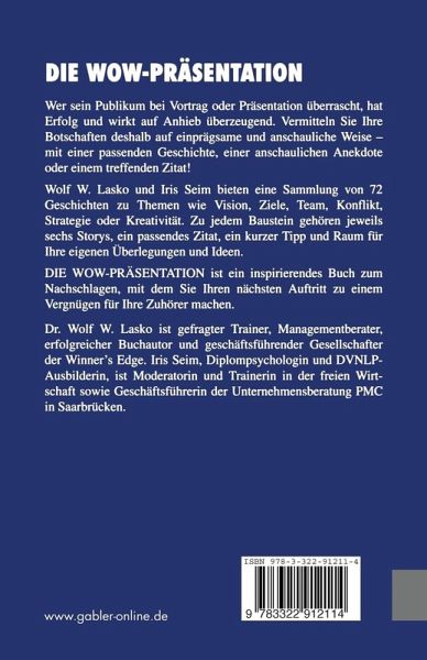 Bei Vorträgen und Präsentationen kommt es darauf an, dem Publikum Inhalte einprägsam zu vermitteln. Wie kaum ein anderes Medium kann eine passende Geschichte das Verstehen unterstützen. Die Autoren bieten eine Sammlung von 72 Geschichten zu 12 führungsrelevanten Themenbereichen, zum Beispiel Strategie, Ziele, Team oder Konflikt. Thematisch geordnet bestehen die einzelnen Kapitel aus je 6 Geschichten mit passendem Zitat, kurzem Kommentar und Transfermöglichkeit für den Leser.