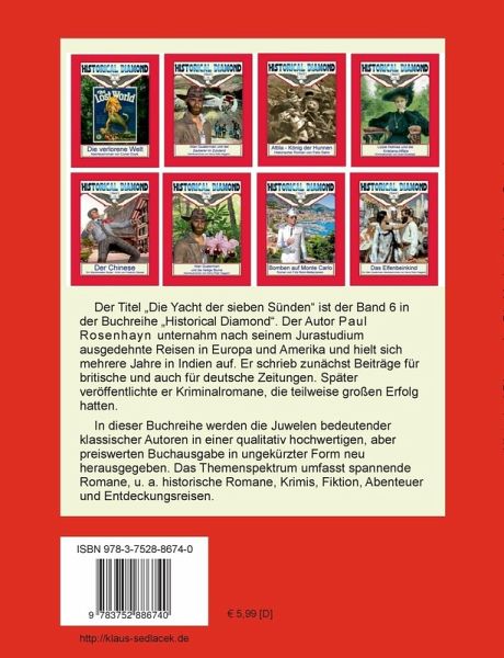 Der Titel 'Die Yacht der sieben Sünden' ist der Band 6 in der Buchreihe 'Historical Diamond'. Der Autor Paul Rosenhayn unternahm nach seinem Jurastudium ausgedehnte Reisen in Europa und Amerika und hielt sich mehrere Jahre in Indien auf. Er schrieb zunächst Beiträge für britische und auch für deutsche Zeitungen. Später veröffentlichte er Kriminalromane, die teilweise großen Erfolg hatten. In dieser Buchreihe werden die Juwelen bedeutender klassischer Autoren in einer qualitativ hochwertigen, aber preiswerten Buchausgabe in ungekürzter Form neu herausgegeben. Das Themenspektrum umfasst spannende Romane, u. a. historische Romane, Krimis, Fiktion, Abenteuer und Entdeckungsreisen.