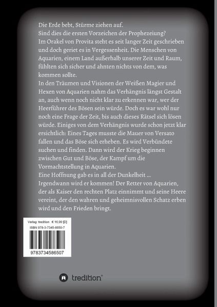 Die Erde bebt, Stürme ziehen auf. Sind dies die ersten Vorzeichen der Prophezeiung? Im Orakel von Provita steht es seit langer Zeit geschrieben und doch geriet es in Vergessenheit. Die Menschen von Aquarien, einem Land außerhalb unserer Zeit und Raum, fühlten sich sicher und ahnten nichts von dem, was kommen sollte. In den Träumen und Visionen der Weißen Magier und Hexen von Aquarien nahm das Verhängnis längst Gestalt an, auch wenn noch nicht klar zu erkennen war, wer der Heerführer des Bösen sein würde. Doch es war wohl nur noch eine Frage der Zeit, bis auch dieses Rätsel sich lösen würde. Einiges von dem Verhängnis wurde schon jetzt klar ersichtlich: Eines Tages musste die Mauer von Versato fallen und das Böse sich erheben. Es wird Verbündete suchen und finden. Dann wird der Krieg beginnen zwischen Gut und Böse, der Kampf um die Vormachtstellung in Aquarien. Eine Hoffnung gab es in all der Dunkelheit ... Irgendwann wird er kommen! Der Retter von Aquarien, der als Kaiser den rechten Platz einnimmt und seine Heere vereint, der den wahren und geheimnisvollen Schatz erben wird und den Frieden bringt.