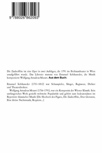 Die Zauberflöte ist eine Oper in zwei Aufzügen, die 1791 im Freihaustheater in Wien uraufgeführt wurde. Das Libretto stammt von Emanuel Schikaneder, die Musik komponierte Wolfgang Amadeus Mozart. Zur Handlung: Der junge Prinz Tamino wird von der Königin der Nacht ausgesandt, um ihre Tochter Pamina zu retten, die vom Fürsten Sarastro entführt wurde. Der Vogelfänger Papageno wird Tamino zur Seite gestellt. Tamino erhält eine Zauberflöte, Papageno ein magisches Glockenspiel, beides von den bis jetzt noch freundlichen Drei Damen der Königin der Nacht. Sie brechen auf, um Pamina zu befreien. Papageno findet Pamina in Sarastros Reich und berichtet ihr, dass der verliebte Tamino zu ihrer Rettung aufgebrochen ist. Sie wollen fliehen, um Tamino entgegenzueilen, treffen dabei jedoch auf Monostatos, dem sie mit Hilfe des Glockenspiels entkommen.... Emanuel Schikaneder (1751-1812) war Schauspieler, Sänger, Regisseur, Dichter und Theaterdirektor. Wolfgang Amadeus Mozart (1756-1791), war ein Komponist der Wiener Klassik. Sein umfangreiches Werk genießt weltweite Popularität und gehört zum bedeutendsten im Repertoire klassischer Musik (Die Hochzeit des Figaro, Die Zauberflöte, Don Giovanni, Eine kleine Nachtmusik, Requiem...)