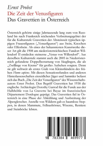 Österreich gehörte einige Jahrtausende lang zum von Russland bis nach Frankreich reichenden Verbreitungsgebiet der für die Kulturstufe Gravettien der Altsteinzeit typischen üppigen Frauenfiguren ("Venusfiguren") aus Stein, Knochen oder Elfenbein. Als eines der bekanntesten Kunstwerke dieser Art gilt die 1908 am niederösterreichischen Fundort Willendorf II entdeckte steinerne "Venus von Willendorf". Aus derselben Kulturstufe stammt auch die 2005 in Niederösterreich gefundene Doppelbestattung von Säuglingen, die als "Zwillinge von Krems" für großes Aufsehen sorgten. Denn sie gilt weltweit als erstes Grab von Kleinstkindern des frühen Homo sapiens. Mit diesen Sensationsfunden und anderen Hinterlassenschaften eiszeitlicher Jäger und Sammler befasst sich das Buch "Die Zeit der Venusfiguren" des Wissenschaftsautors Ernst Probst. Den Begriff Gravettien hat 1938 die englische Archäologin Dorothy Garrod für die Funde aus der Halbhöhle von La Gravette bei Bayac im französischen DépartementDordogne geprägt. Das Gravettien fiel in Österreich in eine Phase der Abkühlung und Ausbreitung der Alpengletscher. Anstelle von Wäldern gab es baumlose Steppen, in denen Mammute, Fellnashörner, Wisente, Rentiere und Steinböcke lebten.