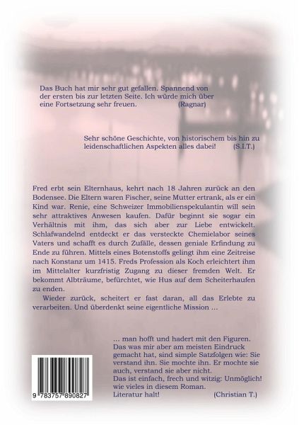 Fred, Zeit seines Lebens Egoist und Zyniker, erbt sein Elternhaus und kehrt nach 18 Jahren zurück an den Bodensee. Die Eltern waren Fischer, seine Mutter ertrank, als er ein Kind war. Renie, eine Schweizer Immobilienspekulantin, will sein sehr attraktives Anwesen kaufen. Dafür beginnt sie sogar ein Verhältnis mit ihm, das sich aber zur Liebe entwickelt. Schlafwandelnd entdeckt er das versteckte Chemielabor seines Vaters und schafft es durch Zufälle, dessen geniale Erfindung zu Ende zu führen.Mittels dieses Botenstoffs und der hinterlassenen Tauchausrüstung gelingt ihm eine Zeitreise nach Konstanz um 1415. Die Stadt platzt wegen des Konzils mit 70.000 Menschen aus allen Mauern. Freds Profession als Koch erleichtert ihm im Mittelalter kurzfristig Zugang zu dieser fremden Welt. Die Freundschaft mit dem armen Straßenjungen Paul sorgt dafür, dass sich Fred zu einem empathischen Menschen entwickelt. Er bekommt Albträume, befürchtet, wie Hus auf dem Scheiterhaufen zu enden.Wieder zurück, verzagt er und scheitert fast daran, all das Erlebte zu verarbeiten. Um die richtigen Schlüsse zu ziehen. Für sein Haus, seine Zukunft, seine Liebe.