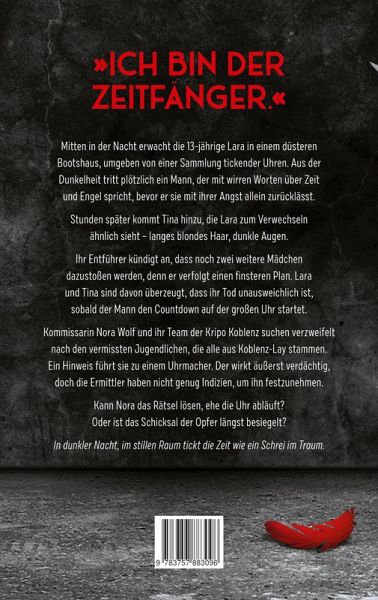 "Ich bin der Zeitfänger." Mitten in der Nacht erwacht die 13-jährige Lara in einem düsteren Bootshaus, umgeben von einer Sammlung tickender Uhren. Aus der Dunkelheit tritt plötzlich ein Mann, der mit wirren Worten über Zeit und Engel spricht, bevor er sie mit ihrer Angst allein zurücklässt.Stunden später kommt Tina hinzu, die Lara zum Verwechseln ähnlich sieht - langes blondes Haar, dunkle Augen.Ihr Entführer kündigt an, dass noch zwei weitere Mädchen dazustoßen werden, denn er verfolgt einen finsteren Plan. Lara und Tina sind davon überzeugt, dass ihr Tod unausweichlich ist, sobald der Mann den Countdown auf der großen Uhr startet.Kommissarin Nora Wolf und ihr Team der Kripo Koblenz suchen verzweifelt nach den vermissten Jugendlichen, die alle aus Koblenz-Lay stammen. Ein Hinweis führt sie zu einem Uhrmacher. Der wirkt äußerst verdächtig, doch die Ermittler haben nicht genug Indizien, um ihn festzunehmen.Kann Nora das Rätsel lösen, ehe die Uhr abläuft? Oder ist das Schicksal derOpfer längst besiegelt?In dunkler Nacht, im stillen Raum tickt die Zeit, wie ein Schrei im Traum.