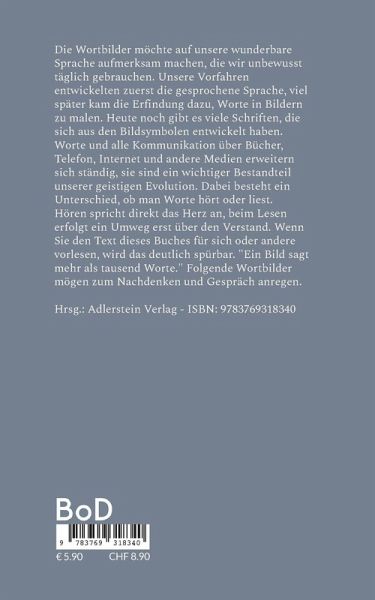 Die Wortbilder möchten auf unsere wunderbare Sprache aufmerksam machen, die wir unbewusst täglich gebrauchen. Unsere Vorfahren entwickelten zuerst die gesprochene Sprache, später kam die Erfindung dazu, Worte in Bildern zu malen. Heute noch gibt es viele Schriften, die sich aus den Bildsymbolen entwickelt haben. Worte und alle Kommunikation über Bücher, Telefon, Internet und andere Medien entwickeln sich ständig weiter, sie sind ein wichtiger Bestandteil unserer geistigen Evolution. Dabei besteht ein Unterschied, ob man Worte hört oder liest. Hören spricht direkt das Herz an, beim Lesen erfolgt der Umweg erst über den Verstand. Wenn Sie den Text dieses Buches für sich oder andere vorlesen, wird das deutlich spürbar. "Ein Bild sagt mehr als tausend Worte". Folgende Wortbilder mögen zum Nachdenken und Gespräch anregen. Hrsg.: Adlerstein Verlag - ISBN: 9783769318340