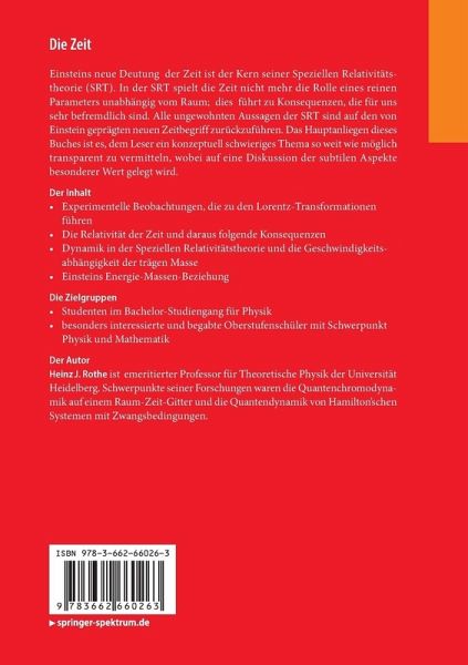 Einsteins neue Deutung der Zeit ist der Kern seiner Speziellen Relativitätstheorie (SRT). In der SRT spielt die Zeit nicht mehr die Rolle eines reinen Parameters unabhängig vom Raum; dies führt zu Konsequenzen, die für uns sehr befremdlich sind. Alle ungewohnten Aussagen der SRT sind auf den von Einstein geprägten neuen Zeitbegriff zurückzuführen. Das Hauptanliegen dieses Buches ist es, dem Leser ein konzeptuell schwieriges Thema so weit wie möglich transparent zu vermitteln, wobei auf eine Diskussion der subtilen Aspekte besonderer Wert gelegt wird.