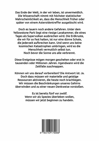 Das Ende der Welt, in der wir leben, ist unvermeidlich. Die Wissenschaft nimmt mit höchster statistischer Wahrscheinlichkeit an, dass die Menschheit früher oder später von einem Asteroidentreffer ausgelöscht wird.Doch es gibt noch andere Risikoszenarien: Supervulkan-Eruption, Mega-Tsunami durch Seebeben, Abschwächung des Erdmagnetfelds, Intensivierung der Sonnenstrahlung. Das langsame Risiko der Kontinentalverschiebung und das womöglich weit schnellere Risiko der alten Erdplatten. Das Risiko durch die Genforschung und sich daraus ergebende Veränderungen unserer Spezies. Die Risiken durch Künstliche Intelligenz.Können wir uns darauf vorbereiten? Die Antwort ist: Ja. Der Ausweg aus der Zeitfalle erfolgt über die Bildung. Das Evolutionsfenster ist ein fundamentaler Wissensbaustein, den alle Menschen erwerben sollten. Wir müssen die Beschränkungen unseres Gehirns überwinden und zu einer neuen Denkweise vorstoßen.Es ist bereits fünf vor zwölf. Wenn wir als Spezies überleben wollen, müssen wir jetzt beginnen zu handeln.