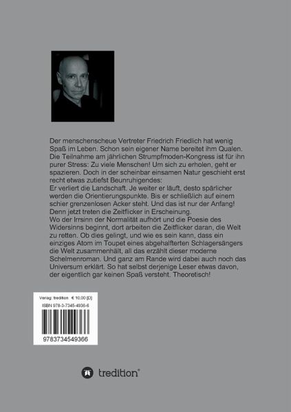 Der menschenscheue Vertreter Friedrich Friedlich hat wenig Spaß im Leben. Schon sein eigener Name bereitet ihm Qualen. Die Teilnahme am jährlichen Strumpfmoden-Kongress ist für ihn purer Stress: Zu viele Menschen! Um sich zu erholen, geht er spazieren. Doch in der scheinbar einsamen Natur geschieht erst recht etwas zutiefst Beunruhigendes:Er verliert die Landschaft. Je weiter er läuft, desto spärlicher werden die Orientierungspunkte. Bis er schließlich auf einem schier grenzenlosen Acker steht. Und das ist nur der Anfang! Denn jetzt treten die Zeitflicker in Erscheinung.Wo der Irrsinn der Normalität aufhört und die Poesie des Widersinns beginnt, dort arbeiten die Zeitflicker daran, die Welt zu retten. Ob dies gelingt, und wie es sein kann, dass ein einziges Atom im Toupet eines abgehalfterten Schlagersängers die Welt zusammenhält, all das erzählt dieser moderne Schelmenroman. Und ganz am Rande wird dabei auch noch das Universum erklärt. So hat selbst derjenige Leser etwas davon, der eigentlich gar keinen Spaß versteht. Theoretisch!
