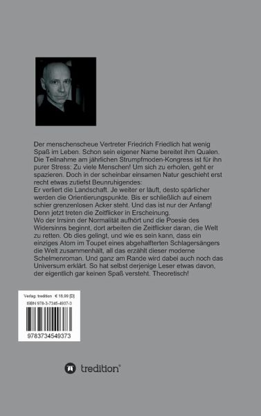 Der menschenscheue Vertreter Friedrich Friedlich hat wenig Spaß im Leben. Schon sein eigener Name bereitet ihm Qualen. Die Teilnahme am jährlichen Strumpfmoden-Kongress ist für ihn purer Stress: Zu viele Menschen! Um sich zu erholen, geht er spazieren. Doch in der scheinbar einsamen Natur geschieht erst recht etwas zutiefst Beunruhigendes:Er verliert die Landschaft. Je weiter er läuft, desto spärlicher werden die Orientierungspunkte. Bis er schließlich auf einem schier grenzenlosen Acker steht. Und das ist nur der Anfang! Denn jetzt treten die Zeitflicker in Erscheinung.Wo der Irrsinn der Normalität aufhört und die Poesie des Widersinns beginnt, dort arbeiten die Zeitflicker daran, die Welt zu retten. Ob dies gelingt, und wie es sein kann, dass ein einziges Atom im Toupet eines abgehalfterten Schlagersängers die Welt zusammenhält, all das erzählt dieser moderne Schelmenroman. Und ganz am Rande wird dabei auch noch das Universum erklärt. So hat selbst derjenige Leser etwas davon, der eigentlich gar keinen Spaß versteht. Theoretisch!