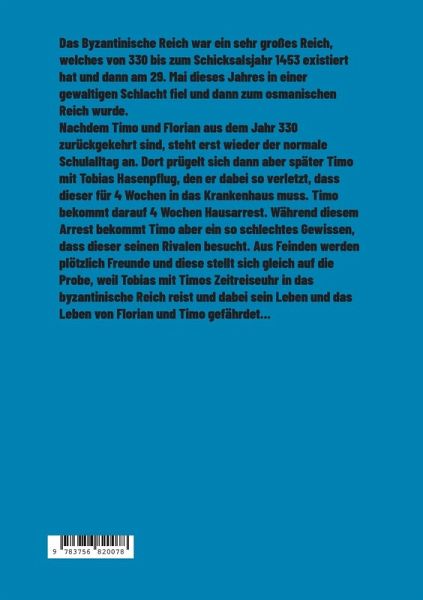 Das Byzantinische Reich war ein sehr großes Reich, welches von 330 bis zum Schicksalsjahr 1453 existiert hat und dann am 29. Mai dieses Jahres in einer gewaltigen Schlacht fiel und dann zum osmanischen Reich wurde.Nachdem Timo und Florian aus dem Jahr 330 zurückgekehrt sind, steht erst wieder der normale Schulalltag an. Dort prügelt sich dann aber später Timo mit Tobias Hasenpflug, den er dabei so verletzt, dass dieser für 4 Wochen in das Krankenhaus muss. Timo bekommt darauf 4 Wochen Hausarrest. Während diesem Arrest bekommt Timo aber ein so schlechtes Gewissen, dass dieser seinen Rivalen besucht. Aus Feinden werden plötzlich Freunde und diese stellt sich gleich auf die Probe, weil Tobias mit Timos Zeitreiseuhr in das byzantinische Reich reist und dabei sein Leben und das Leben von Florian und Timo gefährdet...