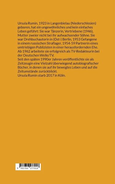 Ursula Rumin, 1923 in Langenbielau (Niederschlesien) geboren, hat ein ungewöhnliches und kein einfaches Leben geführt: Sie war Tänzerin, Vertriebene (1946), Mutter zweier nicht bei ihr aufwachsender Söhne. Sie war Drehbuchautorin in (Ost-) Berlin, 1953 Gefangene in einem russischen Straflager, 1954-59 Partnerin eines umtriebigen Publizisten in einer herausfordernden Ehe. Ab 1962 arbeitete sie erfolgreich als TV-Redakteurin bei der Deutschen Welle/TV.Seit den späten 1990er Jahren veröffentlichte sie als Zeitzeugin eine Vielzahl überwiegend autobiografischer Bücher, in denen sie auf ihr bewegtes Leben und auf die Zeitumstände zurückblickt.Ursula Rumin starb 2017 in Köln.