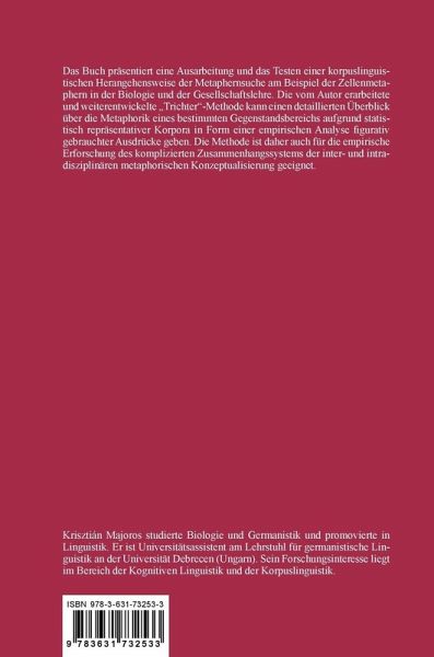 Das Buch präsentiert eine Ausarbeitung und das Testen einer korpuslinguistischen Herangehensweise der Metaphernsuche am Beispiel der Zellenmetaphern in der Biologie und der Gesellschaftslehre. Die vom Autor erarbeitete und weiterentwickelte «Trichter»-Methode kann einen detaillierten Überblick über die Metaphorik eines bestimmten Gegenstandsbereichs aufgrund statistisch repräsentativer Korpora in Form einer empirischen Analyse figurativ gebrauchter Ausdrücke geben. Die Methode ist daher auch für die empirische Erforschung des komplizierten Zusammenhangssystems der inter- und intradisziplinären metaphorischen Konzeptualisierung geeignet.