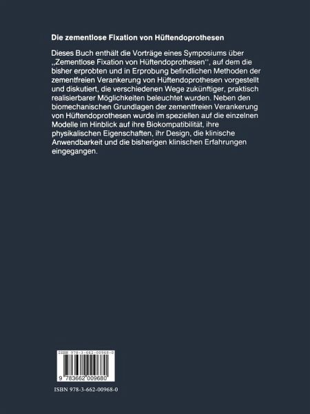 Einführung.- Die Knochenzementmanschette: Untersuchung an 80 Autopsiepräparaten mit Hüftendoprothesen.- Spongiosierungsvorgänge im femoralen Knochenlager konventionell implantierter Hüftendoprothesen.- Die kausale Histogenese (Pauwels, Kummer) und angrenzende biomechanische Erkenntnisse als Grundlage der zementlosen Verankerung von Hüftendoprothesen.- Biokompatibilität und Endoprothesenwerkstoffe.- Induktion der Knochenresorption bei der Prothesenlockerung.- Biochemie der Implantation: Bindung von lebendem Knochengewebe an belastete Endoprothesen - Eine Übersicht.- Möglichkeiten und Grenzen einer zementfreien Verankerung von Endoprothesen.- Histologische Untersuchungen über die Einheilung zementfrei eingebrachter Implantate.- Metallische Implantatwerkstoffe für zementierte und zementfrei verankerte Hüftendoprothesen.- Die Verwendung von Kunststoffen in der Endoprothetik.- Verwendung von Kohlenstoff als Implantatmaterial.- Keramik als Implantatmaterial.- Metall-Keramik-Verbundwerkstoff für die zementfreie Implantatverankerung.- Titan- und Titanlegierungsprothesen mit poröser Drahtdeckschicht.- Implantatfixierung durch Gewebeeinwuchs in eine weiche poröse Beschichtung.- Die zementlose Druckscheibenhüftendoprothese.- Erste Ergebnisse mit der sog. Druckscheibenhüfttotalendoprothese (field study).- Zementfrei verankerte, keramikbeschichtete Implantate, elektrisch nicht leitend, mit physiologischer Krafteinleitung.- Erfahrungen mit der Lord-Prothese.- Erfahrungen mit der Lord-Totalendoprothese - Biomechanik und klinische Ergebnisse.- Frühergebnisse nach Judet - Totalendoprothesenplastik des Hüftgelenks.- Erste klinische Erfahrungen mit einer zementfreien Baukastenfemurhüftendoprothese mit Ti-6Al-4V-Schmiedeschaft und Al2O3-Keramikkugel.- ZementfreieImplantation einer modifizierten M. E. Müller-Geradschaftprothese.- Röntgenologische und klinische Verlaufsbeobachtungen bei zementfrei verankerten Femurschaftprothesen mit und ohne Prothesenkragen.- Titanium-Fiber-Metal: Tierexperimentelle und klinische Untersuchungen.- Der derzeitige Entwicklungsstand von zementfreien Tantal- und Niobstielendoprothesen.- Erste Erfahrungen mit der PM-Prothese.- Erste Erfahrungen mit der PM-Prothese.- 9 Jahre Erfahrung mit isoelastischen Hüftendoprothesen aus plastischem Material.- Experimentelle Aspekte und klinische Früherfahrungen einer zementlosen Hüftgelenkpfanne aus UHMW-Polyäthylen.- Zementlose Verankerung einer Hüftgelenkpfanne aus Polyäthylen.- Erfahrungen mit zementfrei implantierten Polyäthylenpfannen.- Zementlose, isoelastische Totalprothesenarthroplastik des Hüftgelenks: Vorläufiger Bericht der ersten 215 konsekutiven Fälle.- Ergebnisse der teilweise zementfrei implantierten Keramik-Hüftendoprothesen Typ Lindenhof, 4-8 Jahre post operationem.- Keramikhüftgelenkprothesen mit zementfreier Verankerung (Autophor).- Die verschraubte intramedulläre Hüftprothese.- Experimentelle und klinische Erfahrungen mit Kohlenstoffhüftendoprothesen.- Tierexperimentelle Ergebnisse über die Verwendung von kohlefaserverstärkten Kunststoffprothesen.- Regeneration des Femurschafts nach Austauschoperationen und zementlos verankerten Kunststoffprothesen.- 6jährige Erfahrungen im Austausch ausgelockerter Totalprothesen mit selbsthaftenden Keramikprothesen.- Austauschoperationen mit der isoelastischen Hüfttotalprothese.- Erfahrungen nach 3 1/2jähriger Erstimplantation von Lord-Totalendoprothesen und 1 1/2jähriger Erfahrung bei Austauschoperationen nach gelockerten zementierten Prothesen.- Erfahrungen bei Austauschoperationenvon bisher einzementierten Hüfttotalendoprothesen gegen zementlose Lord- und PM-Prothesen.- Reoperation mit der verschraubten intramedullären Hüftprothese.