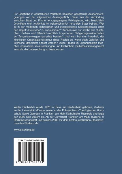 Für Geistliche in gerichtlichen Verfahren bestehen gesetzliche Ausnahmeregelungen von der allgemeinen Aussagepflicht. Diese aus der Verbindung zwischen Staat und Kirche hervorgegangene Privilegierung wird hinsichtlich Grundlage und Legitimität im weltanschaulich neutralen Staat befragt. Wer ist in der modernen katholischen und evangelischen Seelsorgepraxis unter den Begriff "Geistliche" zu subsumieren? Können sich nur solche der christlichen Kirchen und öffentlich-rechtlich korporierten Religionsgemeinschaften auf Zeugnisverweigerungsrechte berufen? Und wem kommen innerhalb der kirchlichen Organisationsstruktur diese Rechte zu, wenn auch Gehilfen und kirchliche Mitarbeiter erfasst werden? Diese Fragen im Spannungsfeld zwischen normativen Voraussetzungen und kirchlichem Selbstbestimmungsrecht versucht die Untersuchung zu beantworten.