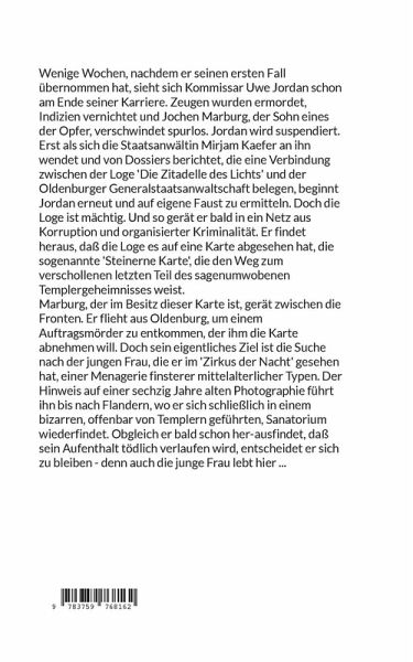 Wenige Wochen, nachdem er seinen ersten Fall übernommen hat, sieht sich Kommissar Uwe Jordan schon am Ende seiner Karriere. Zeugen wurden ermordet, Indizien vernichtet und Jochen Marburg, der Sohn eines der Opfer, verschwindet spurlos. Jordan wird suspendiert. Erst als sich die Staatsanwältin Mirjam Kaefer an ihn wendet und von Dossiers berichtet, die eine Verbindung zwischen der Loge 'Die Zitadelle des Lichts' und der Oldenburger Generalstaatsanwaltschaft belegen, beginnt Jordan erneut und auf eigene Faust zu ermitteln. Doch die Loge ist mächtig. Und so gerät er bald in ein Netz aus Korruption und organisierter Kriminalität. Er findet heraus, daß die Loge es auf eine Karte abgesehen hat, die sogenannte 'Steinerne Karte', die den Weg zum verschollenen letzten Teil des sagenumwobenen Templergeheimnisses weist. Marburg, der im Besitz dieser Karte ist, gerät zwischen die Fronten. Er flieht aus Oldenburg, um einem Auftragsmörder zu entkommen, der ihm die Karte abnehmen will. Doch sein eigentliches Ziel ist die Suche nach der jungen Frau, die er im 'Zirkus der Nacht' gesehen hat, einer Menagerie finsterer mittelalterlicher Typen. Der Hinweis auf einer sechzig Jahre alten Photographie führt ihn bis nach Flandern, wo er sich schließlich in einem bizarren, offenbar von Templern geführten, Sanatorium wiederfindet. Obgleich er bald schon her-ausfindet, daß sein Aufenthalt tödlich verlaufen wird, entscheidet er sich zu bleiben - denn auch die junge Frau lebt hier ...