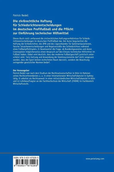 Dieses Buch stellt umfassend die zivilrechtlichen Haftungsverhältnisse für Schiedsrichterentscheidungen im deutschen Profifußball dar. Der Autor begutachtet die Haftung der Schiedsrichter, des DFB und des Ligaverbandes für Spielmanipulationen, falsche Tatsachenentscheidungen und Regelverstöße des Schiedsrichters während eines Fußballpflichtspiels. Er beantwortet die Frage, ob Bundesligavereine und deren Lizenzspieler möglicherweise einen Anspruch auf den Einsatz technischer Hilfsmittel im Fußball haben. Dabei wird deutlich, dass das moderne Fußballgeschäft juristisch unterschätzt wird. Trotz Geltung und Anwendung der Vereinsautonomie darf nicht vergessen werden, dass der Sport keinen rechtsfreien Raum darstellt, sondern der Beachtung zwingender gesetzlicher Normen bedarf.