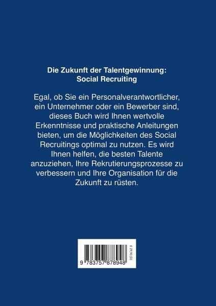 In unserer digitalisierten und vernetzten Welt hat sich die Art und Weise, wie Unternehmen Fachkräfte rekrutieren, radikal verändert. In den letzten Jahren hat sich das Social Recruiting zu einem unverzichtbaren Werkzeug entwickelt, um Talente anzuziehen, Bewerber zu identifizieren und den Rekrutierungsprozess effizienter zu gestalten.In diesem Buch tauchen wir in die faszinierende Welt des Social Recruitings ein und enthüllen die aufregenden Möglichkeiten, die es Unternehmen bietet, um ihr Team mit den besten Talenten aufzubauen. Wir werden die neuesten Trends, Technologien und Strategien untersuchen, die das Social Recruiting vorantreiben und einen tiefen Einblick in die Zukunft der Talentgewinnung geben.Durch die Nutzung von Social-Media-Plattformen wie z.B. LinkedIn, Facebook, Twitter und Instagram können Unternehmen ihre Reichweite erweitern und mit einer breiten Masse von Kandidaten in Kontakt treten. Wir werden erkunden, wie diese Plattformen genutzt werden können, um einestarke Arbeitgebermarke aufzubauen, potenzielle Bewerber anzusprechen und eine direkte Interaktion mit ihnen zu ermöglichen.Neben der Reichweite bietet das Social Recruiting auch einzigartige Einblicke in das Verhalten, die Interessen und die Fähigkeiten der Kandidaten. Wir werden untersuchen, wie Unternehmen diese Informationen nutzen können, um gezielte Kandidatensuchen durchzuführen, Bewerberprofile zu analysieren und die besten Talente für ihre Organisation zu finden. Darüber hinaus werden wir uns mit den Herausforderungen und Risiken des Social Recruitings auseinandersetzen, wie Datenschutz, Diskriminierung und Informationsüberlastung. Wir werden bewährte Verfahren und Strategien erforschen, um diese Hindernisse zu überwinden und sicherzustellen, dass das Social Recruiting ethisch und verantwortungsvoll durchgeführt wird.Begleiten Sie uns auf einer faszinierenden Reise in die Welt des Social Recruitings und entdecken Sie, wie Sie die Macht der sozialen Medien nutzen können, um Ihr Unternehmen zu transformieren und die besten Talente für sich zu gewinnen.