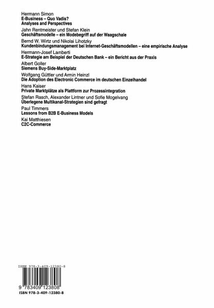 I.- E-Business - Quo Vadis? Analyses and Perspectives.- Geschäftsmodelle - ein Modebegriff auf der Waagschale.- Kundenbindungsmanagement bei Internet-Geschäftsmodellen - eine empirische Analyse.- II.- E-Strategie am Beispiel der Deutschen Bank - ein Bericht aus der Praxis.- Siemens Buy-Side-Marktplatz.- III.- Die Adoption des Electronic Commerce im deutschen Einzelhandel.- Private Marktplätze als Plattform zur Prozessintegration.- Überlegene Multikanal-Strategien sind gefragt.- Lessons from B2B E-Business Models.- C2C-Commerce.- ZfB · Grundsätze und Ziele.