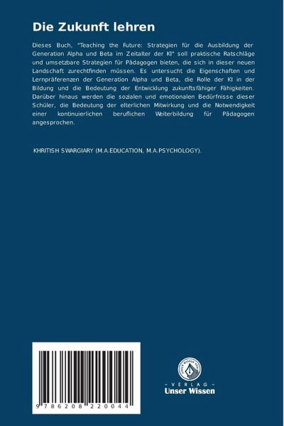 Dieses Buch, "Teaching the Future: Strategien für die Ausbildung der Generation Alpha und Beta im Zeitalter der KI" soll praktische Ratschläge und umsetzbare Strategien für Pädagogen bieten, die sich in dieser neuen Landschaft zurechtfinden müssen. Es untersucht die Eigenschaften und Lernpräferenzen der Generation Alpha und Beta, die Rolle der KI in der Bildung und die Bedeutung der Entwicklung zukunftsfähiger Fähigkeiten. Darüber hinaus werden die sozialen und emotionalen Bedürfnisse dieser Schüler, die Bedeutung der elterlichen Mitwirkung und die Notwendigkeit einer kontinuierlichen beruflichen Weiterbildung für Pädagogen angesprochen.