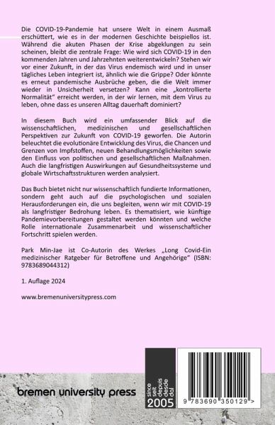 Die COVID-19-Pandemie hat unsere Welt in einem Ausmaß erschüttert, wie es in der modernen Geschichte beispiellos ist. Während die akuten Phasen der Krise abgeklungen zu sein scheinen, bleibt die zentrale Frage: Wie wird sich COVID-19 in den kommenden Jahren und Jahrzehnten weiterentwickeln? Stehen wir vor einer Zukunft, in der das Virus endemisch wird und in unser tägliches Leben integriert ist, ähnlich wie die Grippe? Oder könnte es erneut pandemische Ausbrüche geben, die die Welt immer wieder in Unsicherheit versetzen? Kann eine "kontrollierte Normalität" erreicht werden, in der wir lernen, mit dem Virus zu leben, ohne dass es unseren Alltag dauerhaft dominiert? In diesem Buch wird ein umfassender Blick auf die wissenschaftlichen, medizinischen und gesellschaftlichen Perspektiven zur Zukunft von COVID-19 geworfen. Die Autorin beleuchtet die evolutionäre Entwicklung des Virus, die Chancen und Grenzen von Impfstoffen, neuen Behandlungsmöglichkeiten sowie den Einfluss von politischen und gesellschaftlichen Maßnahmen. Auch die langfristigen Auswirkungen auf Gesundheitssysteme und globale Wirtschaftsstrukturen werden analysiert. Das Buch bietet nicht nur wissenschaftlich fundierte Informationen, sondern geht auch auf die psychologischen und sozialen Herausforderungen ein, die uns begleiten, wenn wir mit COVID-19 als langfristiger Bedrohung leben. Es thematisiert, wie künftige Pandemievorbereitungen gestaltet werden könnten und welche Rolle internationale Zusammenarbeit und wissenschaftlicher Fortschritt spielen werden. Park Min-Jae ist Co-Autorin des Werkes "Long Covid-Ein medizinischer Ratgeber für Betroffene und Angehörige" (9783689044312)