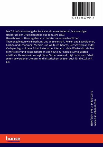 Die Zukunftserwartung des Jesaia ist ein unveränderter, hochwertiger Nachdruck der Originalausgabe aus dem Jahr 1893.Hansebooks ist Herausgeber von Literatur zu unterschiedlichen Themengebieten wie Forschung und Wissenschaft, Reisen und Expeditionen, Kochen und Ernährung, Medizin und weiteren Genres. Der Schwerpunkt des Verlages liegt auf dem Erhalt historischer Literatur. Viele Werke historischer Schriftsteller und Wissenschaftler sind heute nur noch als Antiquitäten erhältlich. Hansebooks verlegt diese Bücher neu und trägt damit zum Erhalt selten gewordener Literatur und historischem Wissen auch für die Zukunft bei.