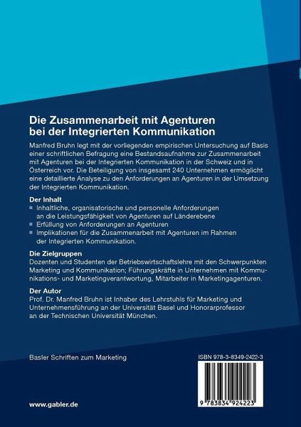 Manfred Bruhn legt mit der vorliegenden empirischen Untersuchung auf Basis einer schriftlichen Befragung eine Bestandsaufnahme zur Zusammenarbeit mit Agenturen bei der Integrierten Kommunikation in der Schweiz und in Österreich vor. Die Beteiligung von insgesamt 240 Unternehmen ermöglicht eine detaillierte Analyse zu den Anforderungen an Agenturen in der Umsetzung der Integrierten Kommunikation.