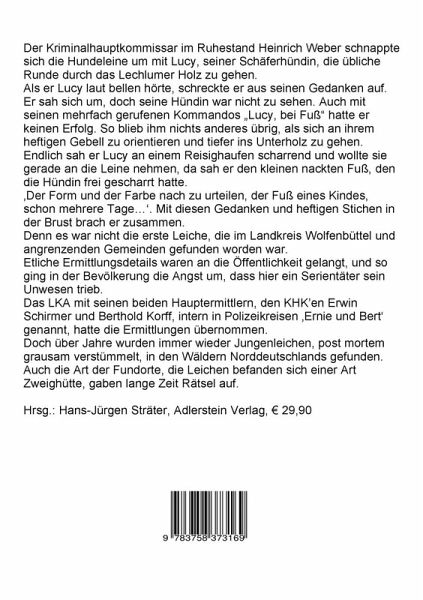 Der Kriminalhauptkommissar im Ruhestand Heinrich Weber schnappte sich die Hundeleine um mit Lucy, seiner Schäferhündin, die übliche Runde durch das Lechlumer Holz zu gehen.Als er Lucy laut bellen hörte, schreckte er aus seinen Gedanken auf. Er sah sich um, doch seine Hündin war nicht zu sehen. Auch mit seinen mehrfach gerufenen Kommandos: Lucy, bei Fuß hatte er keinen Erfolg. So blieb ihm nichts anderes übrig, als sich an ihrem heftigen Gebell zu orientieren und tiefer ins Unterholz zu gehen. Endlich sah er Lucy an einem Reisighaufen scharrend und wollte sie gerade an die Leine nehmen, da sah er den kleinen nackten Fuß, den die Hündin frei gescharrt hatte.Der Form und der Farbe nach zu urteilen, lag der Fuß eines Kindes, schon mehrere Tage. Mit diesen Gedanken und heftigen Stichen in der Brust brach er zusammen.Denn es war nicht die erste Leiche, die im Landkreis Wolfenbüttel und angrenzenden Gemeinden gefunden worden war.Etliche Ermittlungsdetails waren an die Öffentlichkeit gelangt, und so ging in der Bevölkerung die Angst um, dass hier ein Serientäter sein Unwesen trieb.Das LKA mit seinen beiden Hauptermittlern, den KHKen Erwin Schirmer und Berthold Korff, intern in Polizeikreisen Ernie und Bert genannt, hatte die Ermittlungen übernommen.Doch über Jahre wurden immer wieder Jungenleichen, post mortem grausam verstümmelt, in den Wäldern Norddeutschlands gefunden. Auch die Art der Fundorte, die Leichen befanden sich einer Art Zweighütte, gaben lange Zeit Rätsel auf.Herausgeber: Hans-Jürgen Sträter, Adlerstein Verlag
