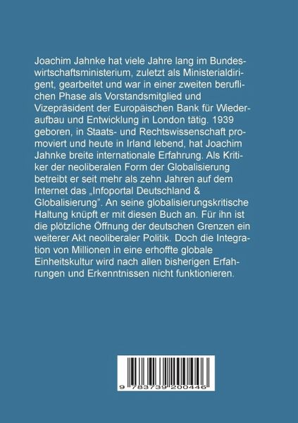 Joachim Jahnke hat viele Jahre lang im Bundeswirtschaftsministerium, zuletzt als Ministerialdirigent, gearbeitet und war in einer zweiten beruflichen Phase als Vorstandsmitglied und Vizepräsident der Europäischen Bank in London tätig. 1939 geboren, in Staats- und Rechtswissenschaft promoviert und heute in Irland lebend, hat Joachim Jahnke breite internationale Erfahrung. Als Kritiker der neoliberalen Form der Globalisierung betreibt er seit mehr als zehn Jahren auf dem Internet das "Infoportal Deutschland & Globalisierung". An seine globalisierungskritische Haltung knüpft er mit diesen Buch an. Für ihn ist die plötzliche Öffnung der deutschen Grenzen ein weiterer Akt neoliberaler Politik. Doch die Integration von Millionen in eine erhoffte globale Einheitskultur wird nach allen bisherigen Erfahrungen und Erkenntnissen nicht funktionieren.