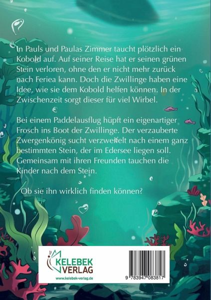 Band 3: Die Zwillinge vom Edersee Kobold und Zwergenkönig In Pauls und Paulas Zimmer taucht plötzlich ein Kobold auf. Auf seiner Reise hat er seinen grünen Stein verloren, ohne den er nicht mehr zurück nach Feriea kann. Doch die Zwillinge haben eine Idee, wie sie dem Kobold helfen können. In der Zwischenzeit sorgt dieser für viel Wirbel. Bei einem Paddelausflug hüpft ein eigenartiger Frosch ins Boot der Zwillinge. Der verzauberte Zwergenkönig sucht verzweifelt nach einem ganz bestimmten Stein, der im Edersee liegen soll. Gemeinsam mit ihren Freunden tauchen die Kinder nach dem Stein. Ob sie ihn wirklich finden können?