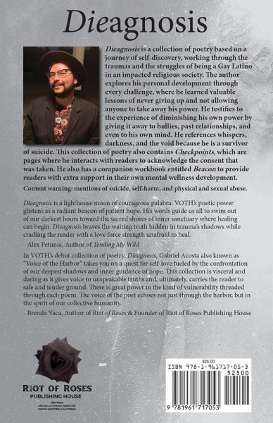 Dieagnosis is a collection of poetry based on a journey of self-discovery, working through the traumas and the struggles of being a Gay Latino in an impacted religious society. The author explores his personal development through every challenge, where he learned valuable lessons of never giving up and not allowing anyone to take away his power. He testifies to the experience of diminishing his own power by giving it away to bullies, past relationships, and even to his own mind. He references whispers, darkness, and the void because he is a survivor of suicide. This collection of poetry also contains Checkpoints, which are pages where he interacts with readers to acknowledge the consent that was taken. He also has a companion workbook entitled Beacon to provide readers with extra support in their own mental wellness development. Content Warning: mentions of suicide, self-harm, and physical and sexual abuse.