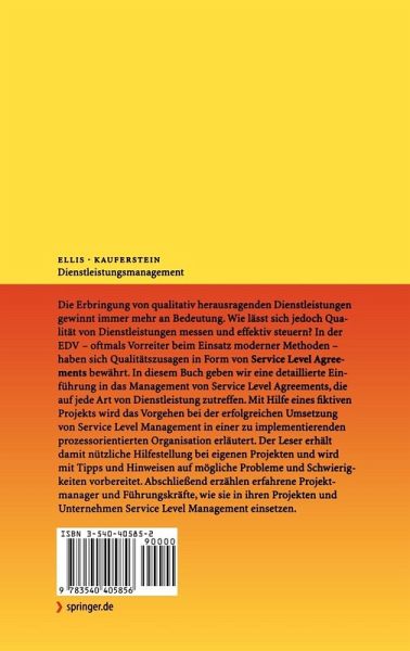 Die Erbringung von qualitativ herausragenden Dienstleistungen gewinnt immer mehr an Bedeutung. Wie lässt sich jedoch Qualität von Dienstleistungen messen und effektiv steuern? In der EDV - oftmals Vorreiter beim Einsatz moderner Methoden - haben sich Qualitätszusagen in Form von Service Level Agreements bewährt. In diesem Buch geben wir eine detaillierte Einführung in das Management von Service Level Agreements, die auf jede Art von Dienstleistung zutreffen. Mit Hilfe eines fiktiven Projekts wird das Vorgehen bei der erfolgreichen Umsetzung von Service Level Management in einer zu implementierenden prozessorientierten Organisation erläutert. Der Leser erhält damit nützliche Hilfestellung bei eigenen Projekten und wird mit Tipps und Hinweisen auf mögliche Probleme und Schwierigkeiten vorbereitet. Abschließend erzählen erfahrene Projektmanager und Führungskräfte, wie sie in ihren Projekten und Unternehmen Service Level Management einsetzen.