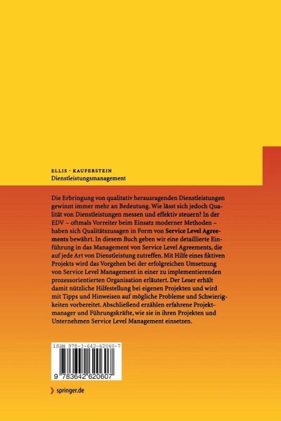 Die Erbringung von qualitativ herausragenden Dienstleistungen gewinnt immer mehr an Bedeutung. Wie lässt sich jedoch Qualität von Dienstleistungen messen und effektiv steuern? In der EDV - oftmals Vorreiter beim Einsatz moderner Methoden - haben sich Qualitätszusagen in Form von Service Level Agreements bewährt. In diesem Buch geben wir eine detaillierte Einführung in das Management von Service Level Agreements, die auf jede Art von Dienstleistung zutreffen. Mit Hilfe eines fiktiven Projekts wird das Vorgehen bei der erfolgreichen Umsetzung von Service Level Management in einer zu implementierenden prozessorientierten Organisation erläutert. Der Leser erhält damit nützliche Hilfestellung bei eigenen Projekten und wird mit Tipps und Hinweisen auf mögliche Probleme und Schwierigkeiten vorbereitet. Abschließend erzählen erfahrene Projektmanager und Führungskräfte, wie sie in ihren Projekten und Unternehmen Service Level Management einsetzen.