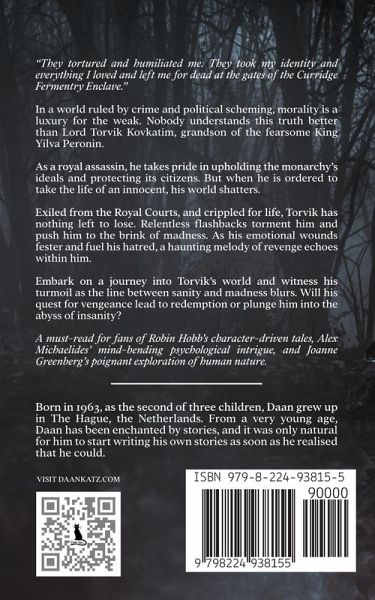 "They tortured and humiliated me. They took my identity and everything I loved, and left me for dead at the gates of the Curridge Fermentry Enclave." In a world ruled by crime and political scheming, morality is a luxury for the weak. Nobody understands this truth better than Lord Torvik Kovkatim, grandson of the fearsome King Yilva Peronin. As a royal assassin, he takes pride in upholding the monarchy's ideals and protecting its citizens. But when he is ordered to take the life of an innocent, his world shatters. Exiled from the Royal Courts, and crippled for life, Torvik has nothing left to lose. Relentless flashbacks torment him and push him to the brink of madness. As his emotional wounds fester and fuel his hatred, a haunting melody of revenge echoes within him. Embark on a journey into Torvik's world and witness his turmoil as the line between sanity and madness blurs. Will his quest for vengeance lead to redemption or plunge him into the abyss of insanity? A must-read for fans of Robin Hobb's character-driven tales, Alex Michaelides' mind-bending psychological intrigue, and Joanne Greenberg's poignant exploration of human nature.