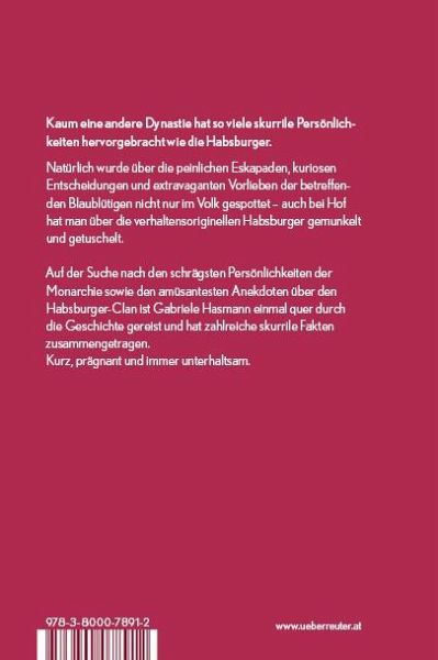 Auf der Suche nach den schrägsten Persönlichkeiten der Monarchie sowie den amüsantesten Anekdoten über den Habsburger-Clan ist Gabriele Hasmann einmal quer durch die Geschichte gereist und hat zahlreiche skurrile Fakten zusammengetragen.