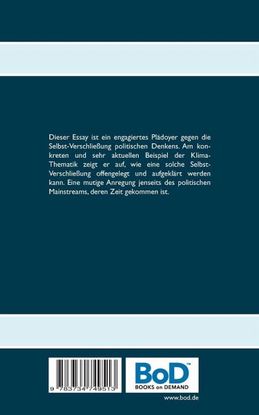 Dieser Essay ist ein engagiertes Plädoyer gegen eine Selbst-Verschließung des politischen Denkens. Am konkreten und sehr aktuellen Beispiel der Klima-Thematik zeigt er auf, wie eine solche Selbst-Verschließung offengelegt und aufgeklärt werden kann. Eine mutige Anregung jenseits des politischen Mainstreams, deren Zeit gekommen ist.