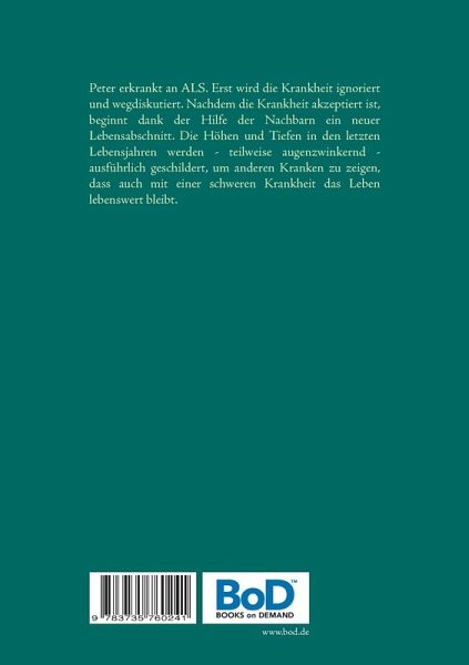 Peter erkrankt an ALS. Zuerst wird die Krankheit ignoriert und wegdiskutiert. Nachdem die Krankheit akzeptiert ist, beginnt Dank der Hilfe der Nachbarn ein neuer Lebensabschnitt. Die Höhen und Tiefen in den letzten Lebensjahren werden - teilweise augenzwinkernd - ausführlich geschildert, um anderen Kranken zu zeigen, dass auch mit einer schweren Krankheit das Leben lebenswert bleibt.