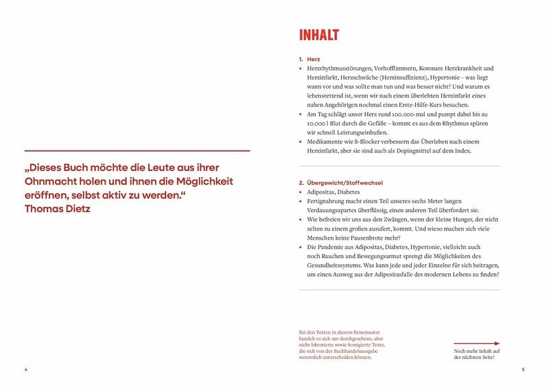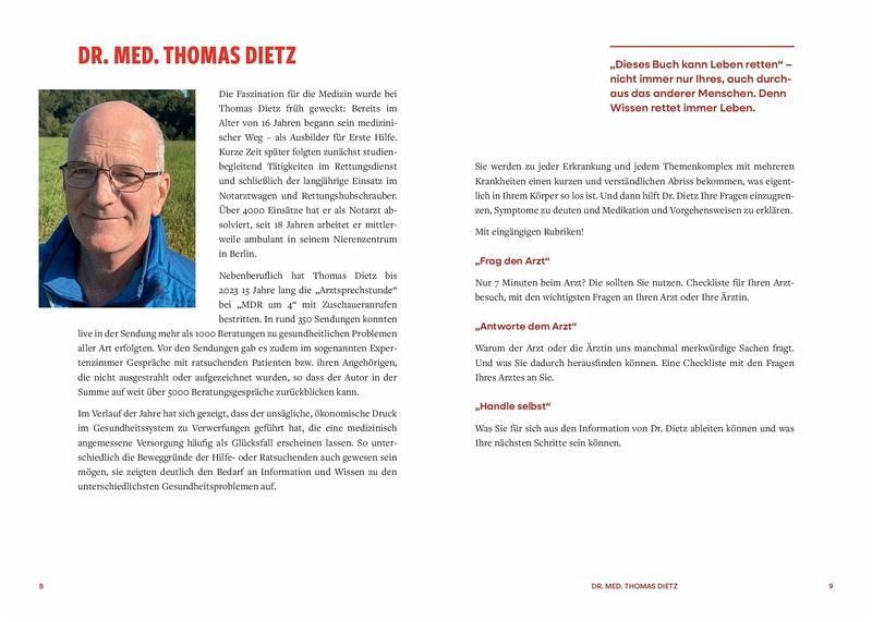 Gute Medizin braucht Zeit. Diese Zeit nimmt sich Dr. med. Thomas Dietz für uns. Auf Augenhöhe und mit einer Prise Humor erklärt er, wie unser Körper funktioniert, räumt mit Medizinmythen auf und nimmt uns die Furcht im Umgang mit den Göttinnen und Göttern in Weiß. Ob das Herz aus dem Takt gerät, das Atemholen Probleme macht oder die Blutglukose Achterbahn fährt: Dr. Dietz weiß, welche Fragen und Ängste im Zusammenhang mit einer Diagnose oder schmerzhaften Symptomen aufkommen, und er hat die richtigen Antworten und Empfehlungen parat. Mit Erste-Hilfe-Tipps und effizienter Frageliste für wirklich informative Arzt-Patient-Gespräche - so führt Sie dieses Buch sicher durch den Dschungel des Gesundheitssystems.