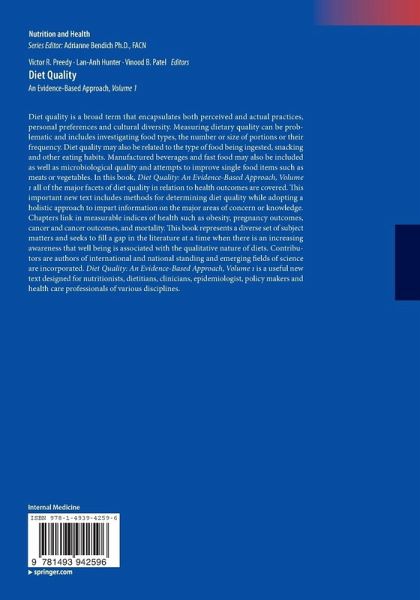 Diet quality is a broad term that encapsulates both perceived and actual practices, personal preferences and cultural diversity. Measuring dietary quality can be problematic and includes investigating food types, the number or size of portions or their frequency. Diet quality may also be related to the type of food being ingested, snacking and other eating habits. Manufactured beverages and fast food may also be included as well as microbiological quality and attempts to improve single food items such as meats or vegetables. In this book, Diet Quality: An Evidence-Based Approach, Volume 1 all of the major facets of diet quality in relation to health outcomes are covered. This important new text includes methods for determining diet quality while adopting a holistic approach to impart information on the major areas of concern or knowledge.