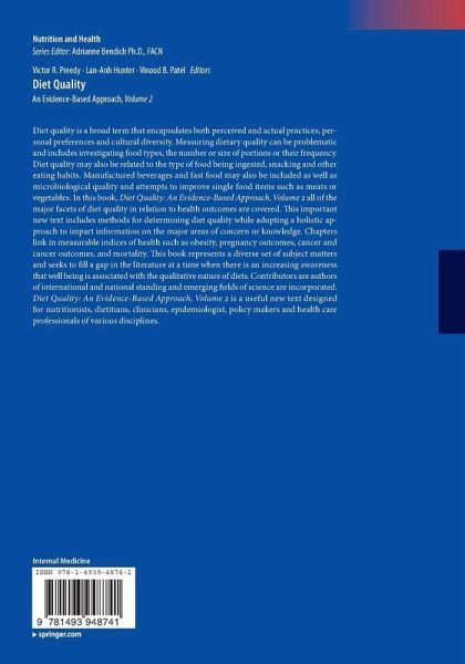 Diet quality is a broad term that encapsulates both perceived and actual practices, personal preferences and cultural diversity. Measuring dietary quality can be problematic and includes investigating food types, the number or size of portions or their frequency. Diet quality may also be related to the type of food being ingested, snacking and other eating habits. Manufactured beverages and fast food may also be included as well as microbiological quality and attempts to improve single food items such as meats or vegetables. In this book, Diet Quality: An Evidence-Based Approach, Volume 2 all…mehr