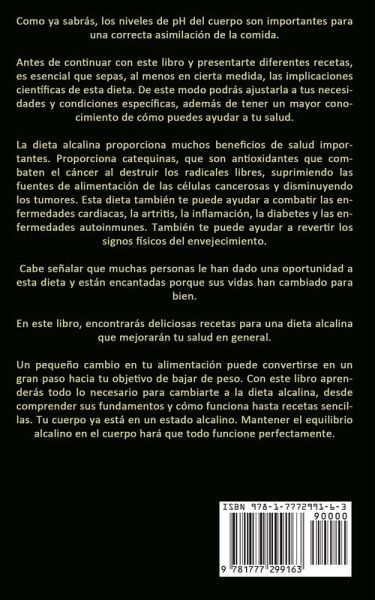 Como ya sabrás, los niveles de pH del cuerpo son importantes para una correcta asimilación de la comida. Antes de continuar con este libro y presentarte diferentes recetas, es esencial que sepas, al menos en cierta medida, las implicaciones científicas de esta dieta. De este modo podrás ajustarla a tus necesidades y condiciones específicas, además de tener un mayor conocimiento de cómo puedes ayudar a tu salud. La dieta alcalina proporciona muchos beneficios de salud importantes. Proporciona catequinas, que son antioxidantes que combaten el cáncer al destruir los radicales libres, suprimiendo las fuentes de alimentación de las células cancerosas y disminuyendo los tumores. Esta dieta también te puede ayudar a combatir las enfermedades cardiacas, la artritis, la inflamación, la diabetes y las enfermedades autoinmunes. También te puede ayudar a revertir los signos físicos del envejecimiento. Cabe señalar que muchas personas le han dado una oportunidad a esta dieta y están encantadas porque sus vidas han cambiado para bien. En este libro, encontrarás deliciosas recetas para una dieta alcalina que mejorarán tu salud en general. Un pequeño cambio en tu alimentación puede convertirse en un gran paso hacia tu objetivo de bajar de peso. Con este libro aprenderás todo lo necesario para cambiarte a la dieta alcalina, desde comprender sus fundamentos y cómo funciona hasta recetas sencillas. Tu cuerpo ya está en un estado alcalino. Mantener el equilibrio alcalino en el cuerpo hará que todo funcione perfectamente.