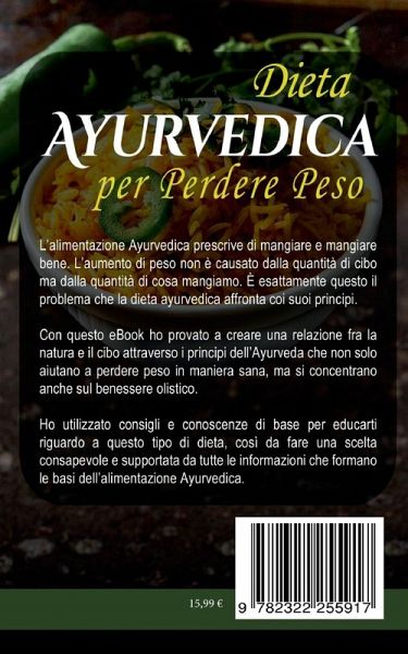L'alimentazione Ayurvedica prescrive di mangiare e mangiare bene. L'aumento di peso non è causato dalla quantità di cibo ma dalla quantità di cosa mangiamo. È esattamente questo il problema che la dieta ayurvedica affronta coi suoi principi. Con questo libro ho provato a creare una relazione fra la natura e il cibo attraverso i principi dell'Ayurveda che non solo aiutano a perdere peso in maniera sana, ma si concentrano anche sul benessere olistico. Ho utilizzato consigli e conoscenze di base per educarti riguardo a questo tipo di dieta, così da fare una scelta consapevole e supportata da tutte le informazioni che formano le basi dell'alimentazione Ayurvedica.