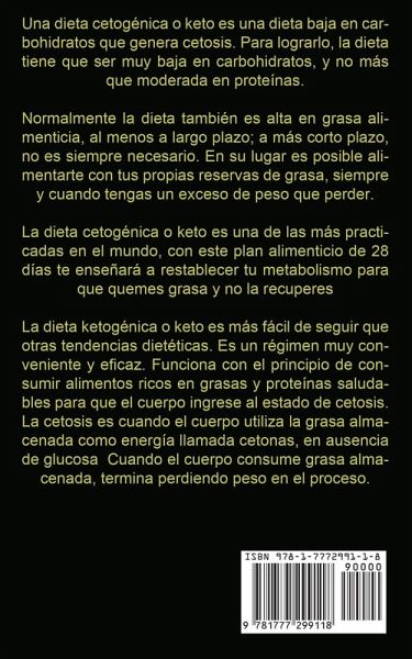 Una dieta cetogénica o keto es una dieta baja en carbohidratos que genera cetosis. Para lograrlo, la dieta tiene que ser muy baja en carbohidratos, y no más que moderada en proteínas. Normalmente la dieta también es alta en grasa alimenticia, al menos a largo plazo; a más corto plazo, no es siempre necesario. En su lugar es posible alimentarte con tus propias reservas de grasa, siempre y cuando tengas un exceso de peso que perder. La dieta cetogénica o keto es una de las más practicadas en el mundo, con este plan alimenticio de 28 días te enseñará a restablecer tu metabolismo para que quemes grasa y no la recuperes La dieta ketogénica o keto es más fácil de seguir que otras tendencias dietéticas. Es un régimen muy conveniente y eficaz. Funciona con el principio de consumir alimentos ricos en grasas y proteínas saludables para que el cuerpo ingrese al estado de cetosis. La cetosis es cuando el cuerpo utiliza la grasa almacenada como energía llamada cetonas, en ausencia de glucosa Cuando el cuerpo consume grasa almacenada, termina perdiendo peso en el proceso.