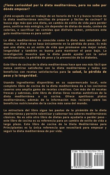 ¿Tiene curiosidad por la dieta mediterránea, pero no sabe por dónde empezar? ¿Está ocupado con un trabajo de un horario de 9 a 5 y busca recetas de la dieta mediterránea sencillas de preparar y fáciles de cocinar? Si busca algo más que una dieta, un cambio de estilo de vida para perder peso, sentirse más enérgico, sin depender de dietas de moda, conteo de calorías, o sacrificar las comidas que disfruta comer, ¡entonces esta guía mediterránea es para usted! La dieta mediterránea es conocida como la dieta más saludable del mundo. La dieta no se basa únicamente en la pérdida de peso. Es más que una dieta; es un estilo de vida que promueve una mejor salud, longevidad y también es buena para mantener el peso bajo. La investigación muestra que la dieta puede ayudar con la salud cardiovascular, la pérdida de peso y la prevención de la diabetes. Este libro de cocina de la dieta mediterránea hace que sea más fácil que nunca sentirse satisfecho con la dieta mediterránea y todos sus beneficios con recetas satisfactorias para la salud, la pérdida de peso y la longevidad. Usando ingredientes disponibles en su supermercado local, este completo libro de cocina de la dieta mediterránea da a los cocineros caseros una amplia gama de recetas creativas. Con más de 60 recetas frescas y sabrosas, este libro de dietas lleva recetas auténticas de la dieta mediterránea a su cocina. Ofrece apetitosos platos mediterráneos, además de la información más reciente sobre los beneficios nutricionales de la cocina más sana del mundo. La estructura del libro sigue las pautas de la pirámide de la dieta mediterránea y permite ralentizar y saborear los sabores mediterráneos clásicos. No es sólo otro libro de dietas para ayudarle a perder peso - este libro de cocina es su referencia para un cambio de estilo de vida a largo plazo. Este libro de cocina de la Dieta Mediterránea para Principiantes es la única referencia que necesitará para empezar y seguir la dieta mediterránea de por vida. En este libro, usted descubrirá: Qué es la dieta mediterránea y su historia Los principales componentes de la dieta mediterránea Increíbles beneficios para la salud por la dieta mediterránea, científicamente probados El estilo de vida mediterráneo Guía de compras del mediterráneo Consejos y técnicas de cocina Consejos para que la dieta mediterránea forme parte de su vida Planificación de comidas Recetas para desayunos Recetas para el almuerzo Recetas para la cena Aperitivos y snacks Recetas de ensaladas y sopas Pasta y cuscús Recetas de postres Y mucho, mucho más! Estas recetas clásicas de la dieta mediterránea combinan ingredientes fáciles de encontrar con una preparación rápida y tiempo de cocción eficaz para que pueda pasar menos tiempo en la cocina y más tiempo disfrutando de la comida con su familia y vivir el estilo de vida mediterráneo al máximo. Las recetas serán las delicias de su paladar; ¡alimentarán su cuerpo y su alma! Entonces, ¿qué está esperando? Haga clic en "Comprar ahora" y empiece a disfrutar de las deliciosas recetas mediterráneas hoy mismo!