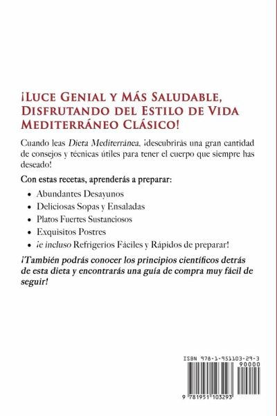 ¡Luce Genial y Más Saludable, Disfrutando del Estilo de Vida Mediterráneo Clásico! Cuando leas Dieta Mediterránea , ¡descubrirás una gran cantidad de consejos y técnicas útiles para tener el cuerpo que siempre has deseado! Con estas recetas, aprenderás a preparar: * Abundantes Desayunos * Deliciosas Sopas y Ensaladas * Platos Fuertes Sustanciosos * Exquisitos Postres * ¡e incluso Refrigerios Fáciles y Rápidos de preparar! ¡También podrás conocer los principios científicos detrás de esta dieta y encontrarás una guía de compra muy fácil de seguir! No esperes más para disfrutar del cuerpo delgado y saludable que mereces – ¡Obtén tu copia de Dieta Mediterránea ya mismo!